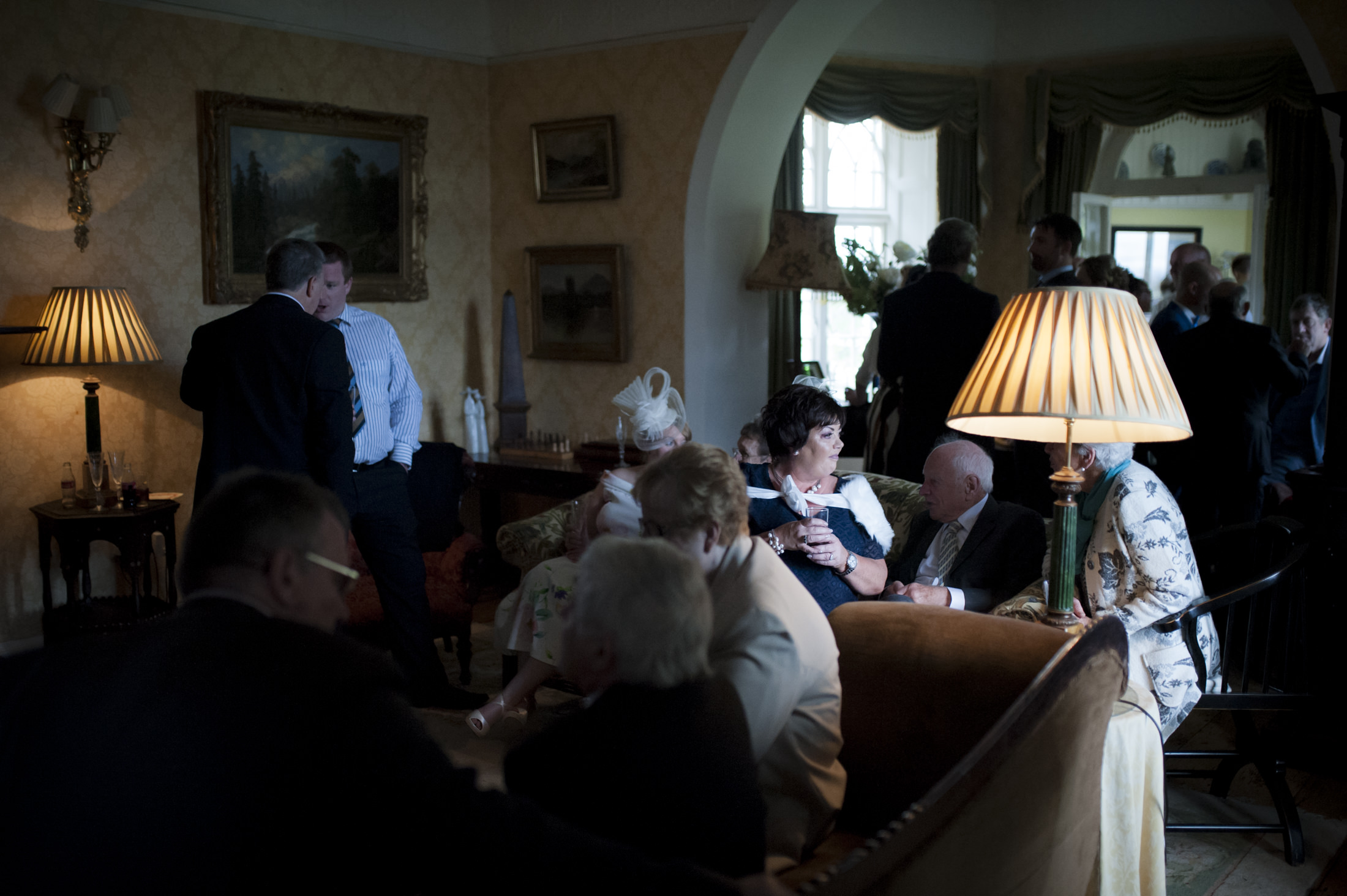 This is the result, I loved the lamp stands at the top of the stair case. So I wanted to try an include them in a shot. This is an exposure of 1/6 sec, to allow as much light into the image as possible. I had my trusted assistant for the day (groomsman John, thank you!!) to the right of Laura and Eoin, with a large soft box.